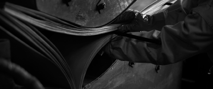 Plywood was first used to make furniture in 1930. Tendo Mokko began using it in 1947, seven years after the company was founded and right after the end of World War II. It was one of the first Japanese companies to make practical use of the material. Many thin layers of wood are glued together, inserted into a jig(a different one for each type of product) and then formed with heat and pressure in an enormous press. The explanation may sound simple, but all of the work is done by hand.